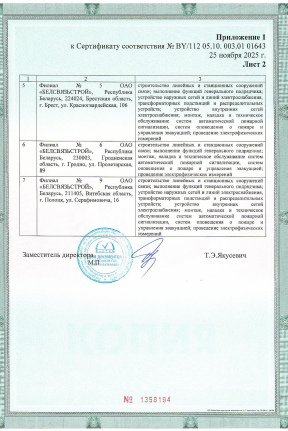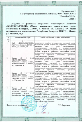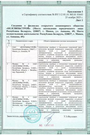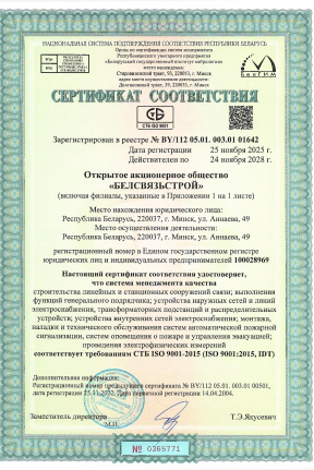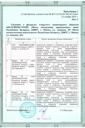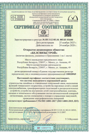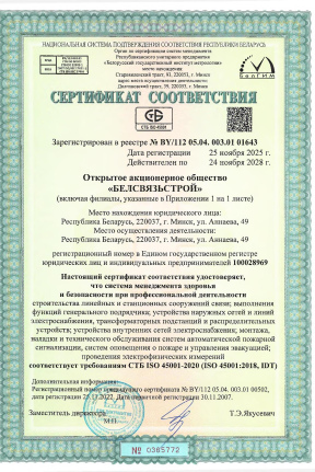 Сертификаты, выданные РУП «Белорусский государственный институт метрологии», о соответствии системе менеджмента качества (СТБ ISО 9001-2015), системе менеджмента здоровья и безопасности при профессиональной деятельности (СТБ ISO 45001-2020) и системе управления (менеджмента) окружающей среды (СТБ ISO 14001-2017).